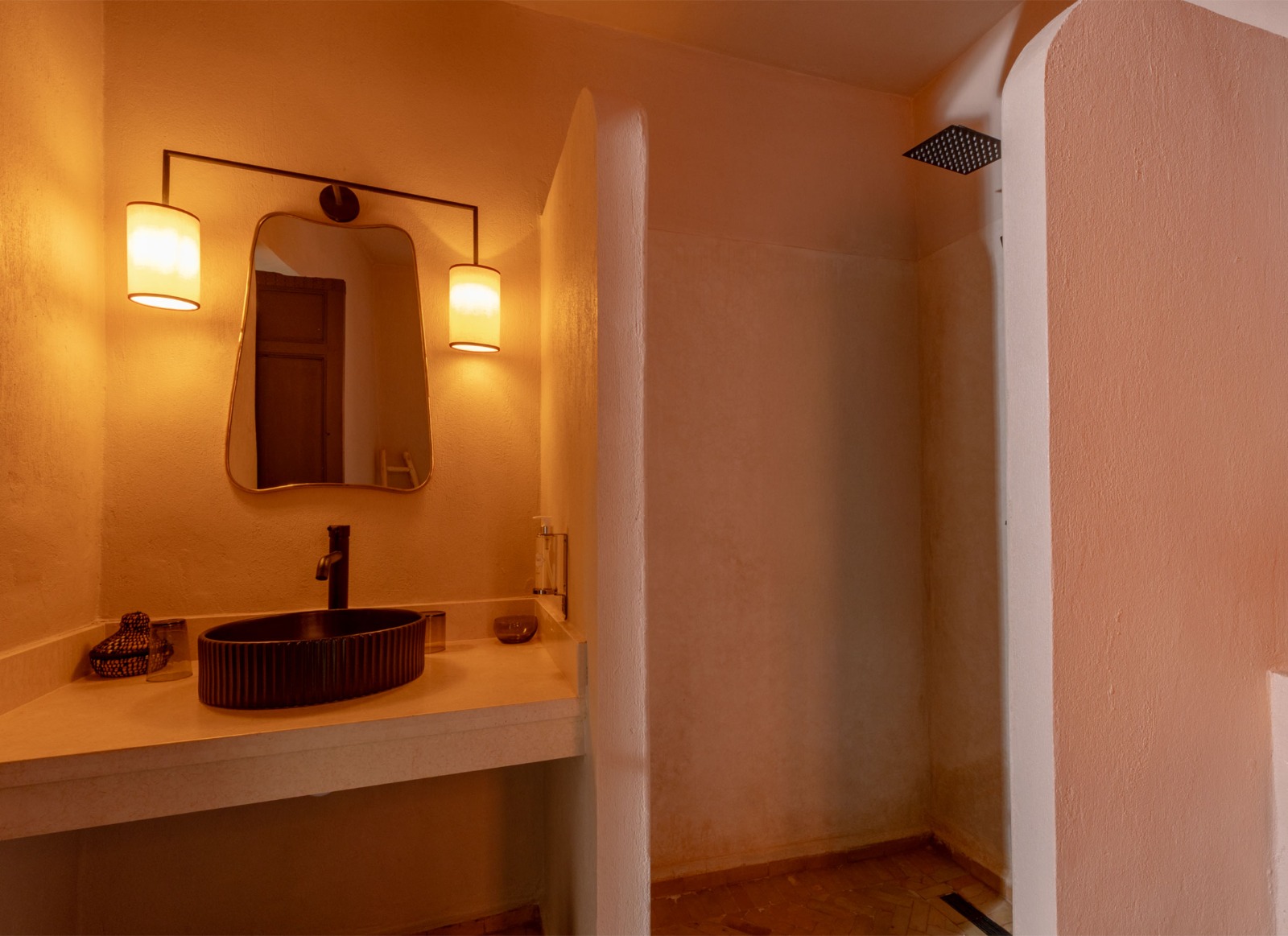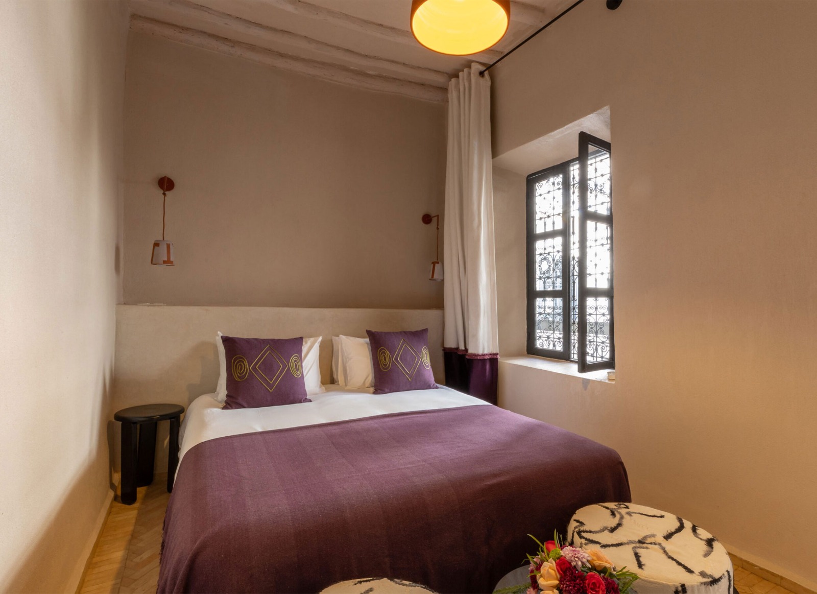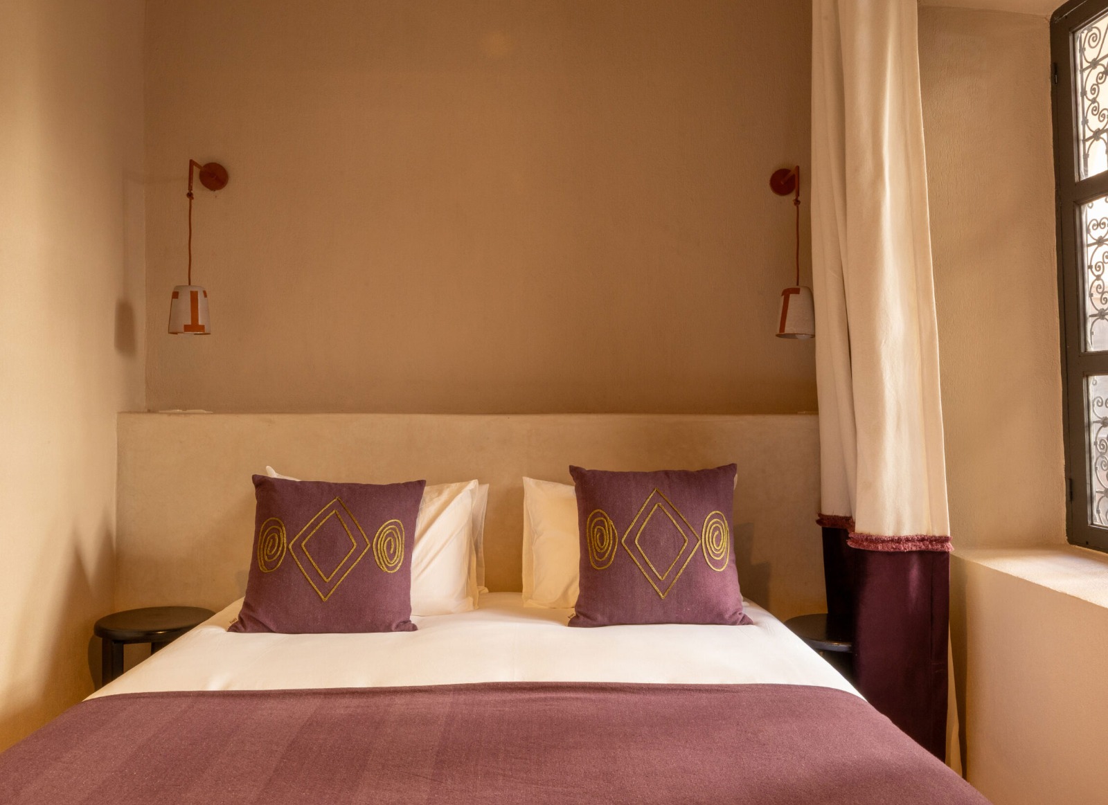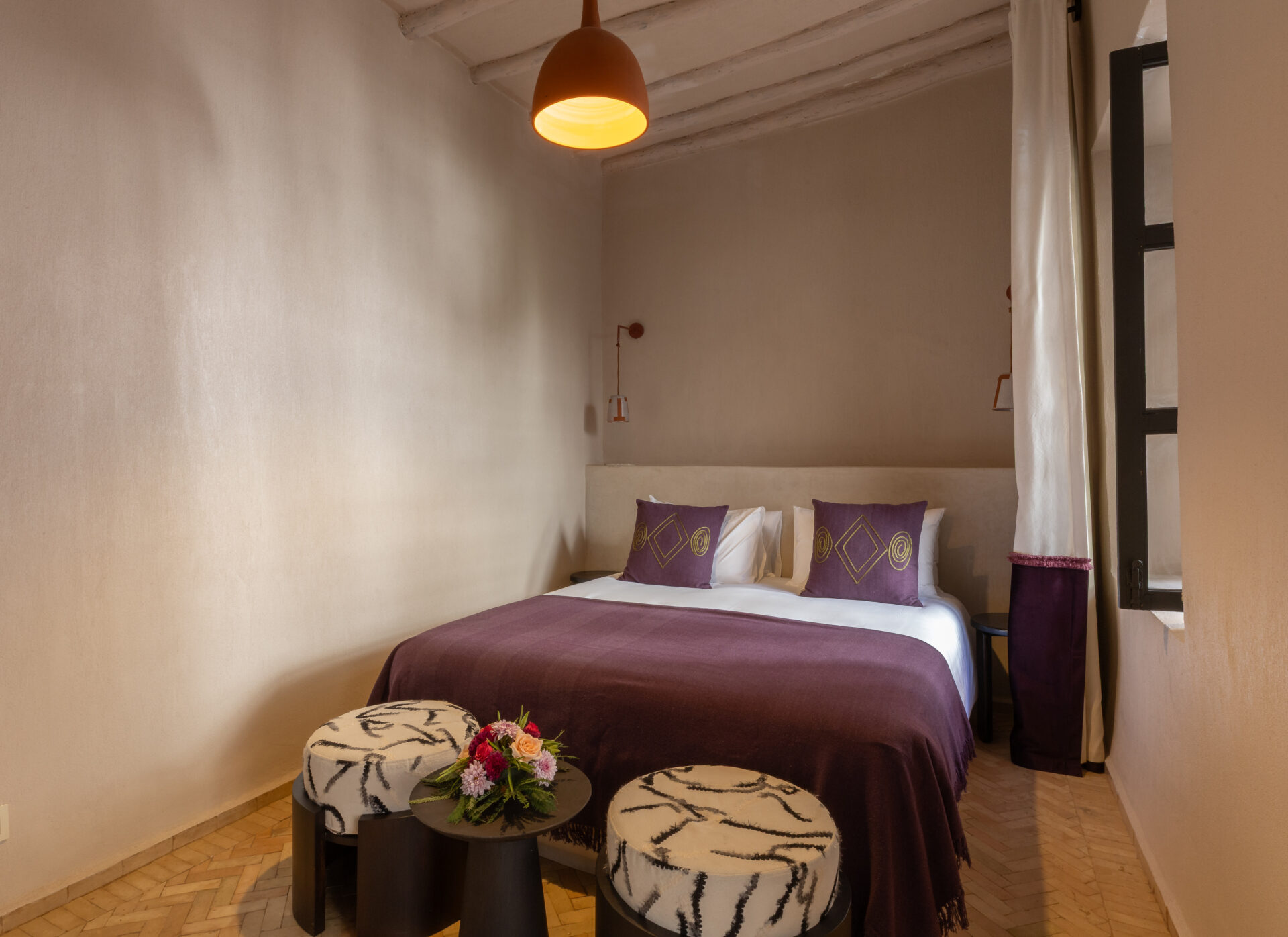 Cette chambre chaleureuse allie charme traditionnel et confort moderne. Son lit double habillé de tissus mauves, sa lumière douce et ses matériaux naturels créent une atmosphère apaisante.